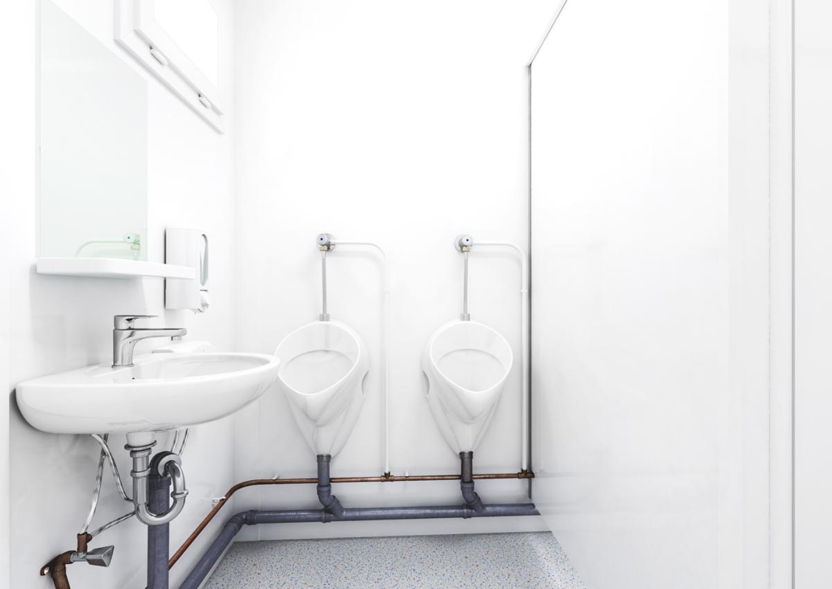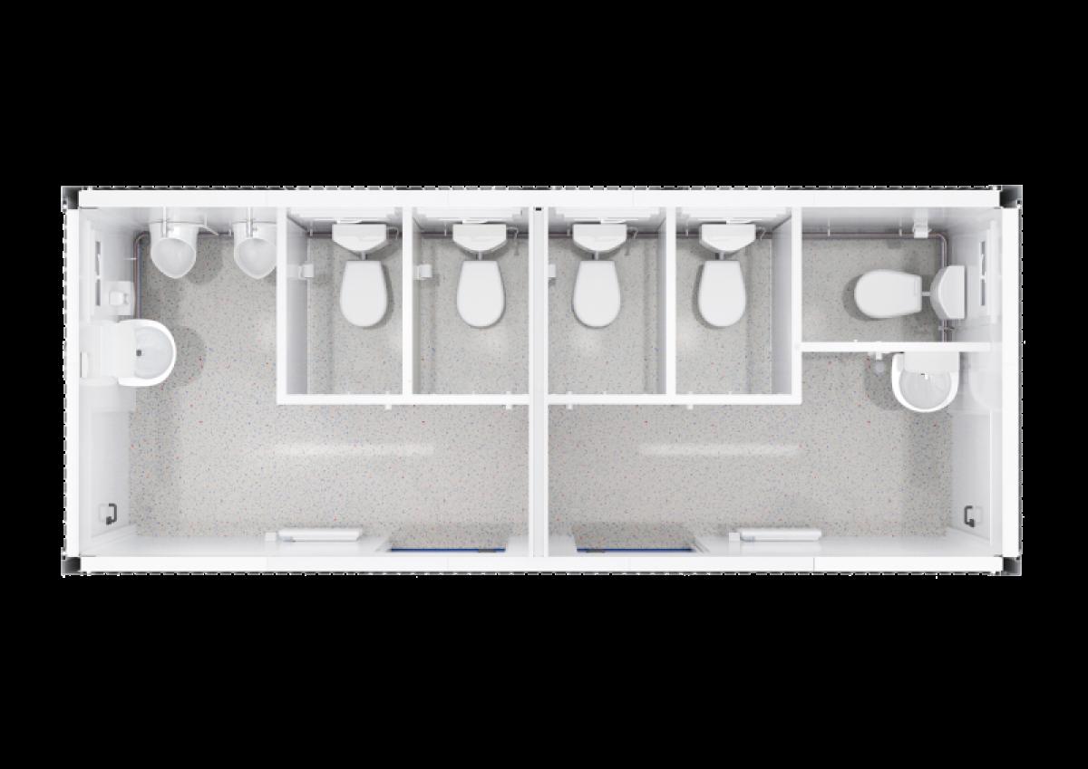 Der Innenraum des 20-Fuß-Containers überzeugt durch hohe Funktionalität und eine vergleichsweise großzügige Aufteilung. So stehen im Damenbereich drei abschließbare Toiletten zur Verfügung, im Vorraum sind ein Waschbecken mit Seifen- und Handtuchspender sowie die Heizung untergebracht. Der Herrenbereich verfügt über zwei separate Toiletten, zwei Urinale sowie ebenfalls über Waschbecken und Heizung. Durch die räumliche Trennung sind Damen- und Herrenbereich gleichzeitig nutzbar.