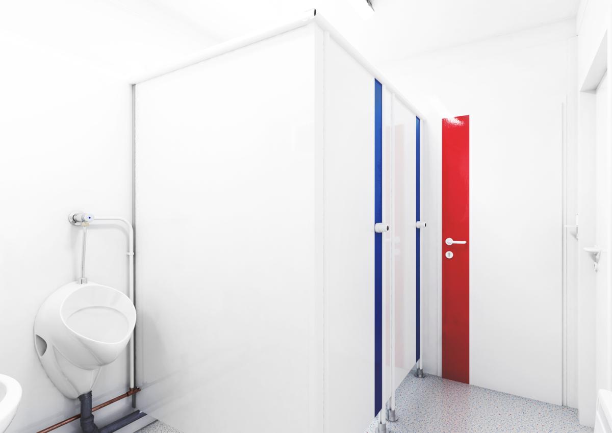 Mit seinen vier Außentüren eignet sich der Construction Line Sanitärcontainer D/H Flexi für vielfältige Varianten der Nutzung und Aufstellung. Zwei WC-Bereiche mit separaten Eingängen für Damen und Herren bieten zudem ein hohes Maß an Privatsphäre.
