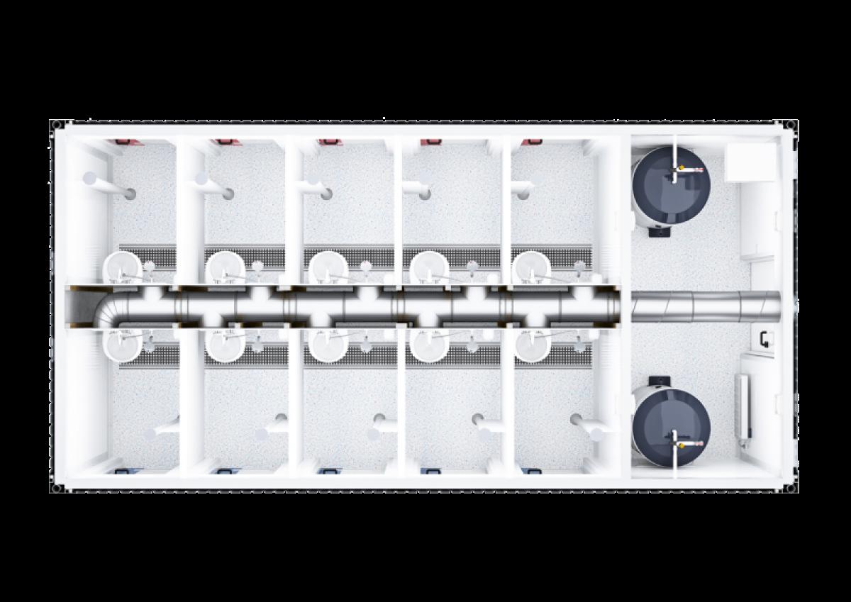 Ob Damen oder Herren – der Dusch-Container aus der Basic Line hat Platz für 10 Personen. Hier wird Raum besonders effizient genutzt. Ihr Vorteil: Ein optimales Preis-Leistungs-Verhältnis.