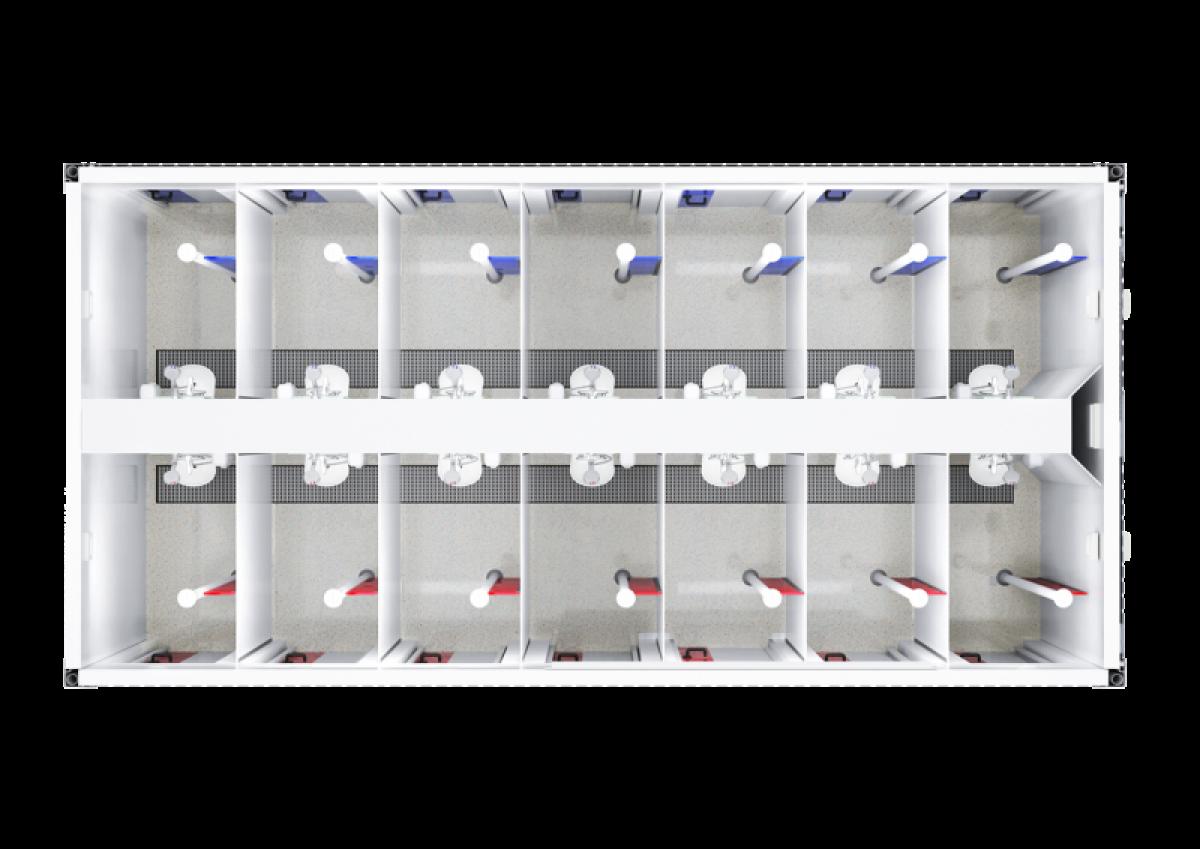 Die Deckenheizung sorgt für eine gleichmäßige Wärmeverteilung und ein dauerhaft angenehmes Raumklima. Zum Wohlfühlen tragen auch die separaten Duschkabinen zum Abschließen sowie kleine, private Umkleiden bei. Ein Spiegel und ein Waschbecken pro Duschabteil machen den Komfort perfekt. Der Container wird komplett angeliefert und auf Wunsch angeschlossen, Aufbauzeiten entfallen. Einfacher geht es nicht.