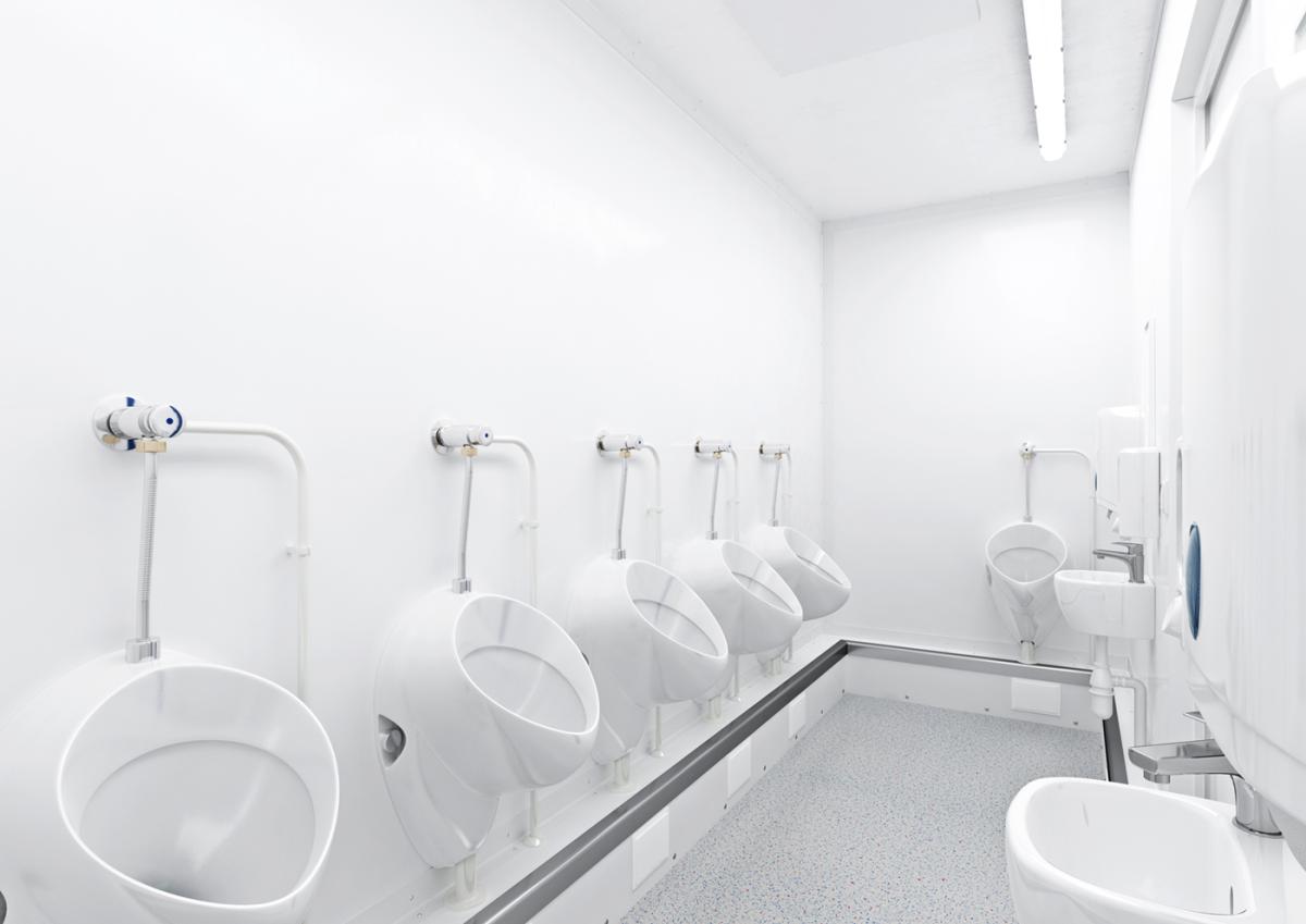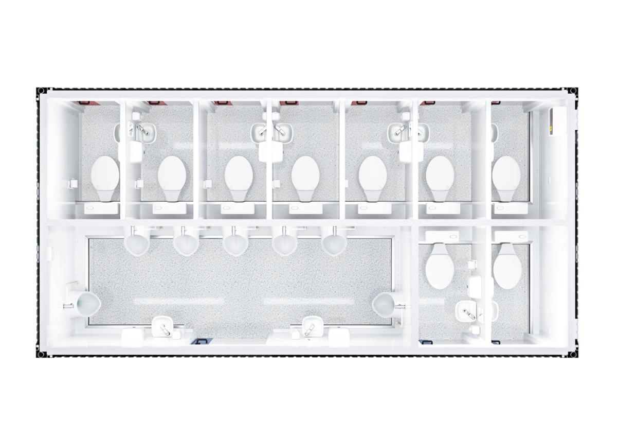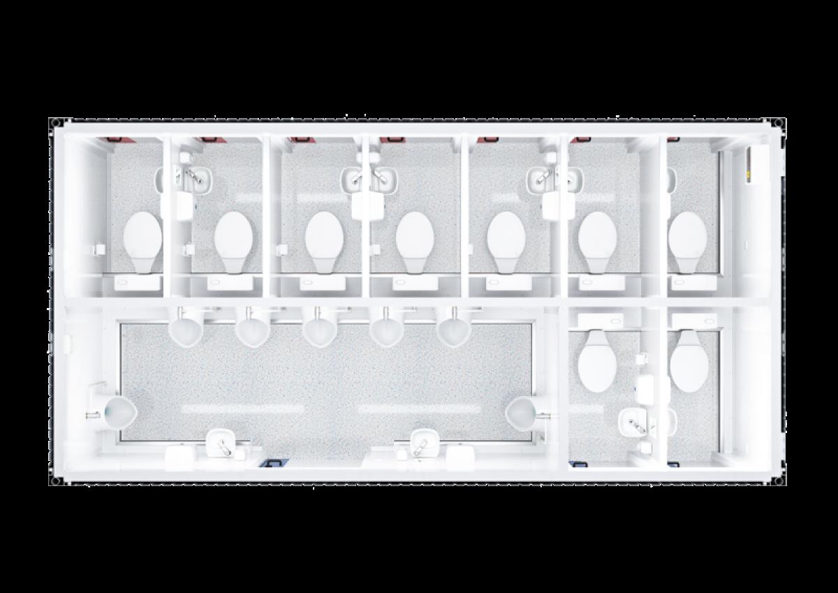 Neun Toiletten und sieben Urinale in einem Container – die optimale Raumaufteilung macht es möglich. Auf der einen Seite des Containers befindet sich der Herrenbereich mit den Urinalen und zwei Toiletten, auf der anderen Seite sind sieben Damentoiletten untergebracht.