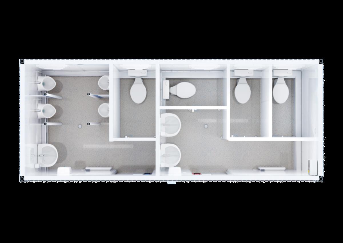 Der WC-Container D/H aus der Basic Line ist ein echtes Raumwunder. Die Grundfläche von rund 15 Quadratmetern wird höchst effizient genutzt. Durch seine perfekte Aufteilung kann der Sanitärcontainer von acht Personen gleichzeitig genutzt werden.