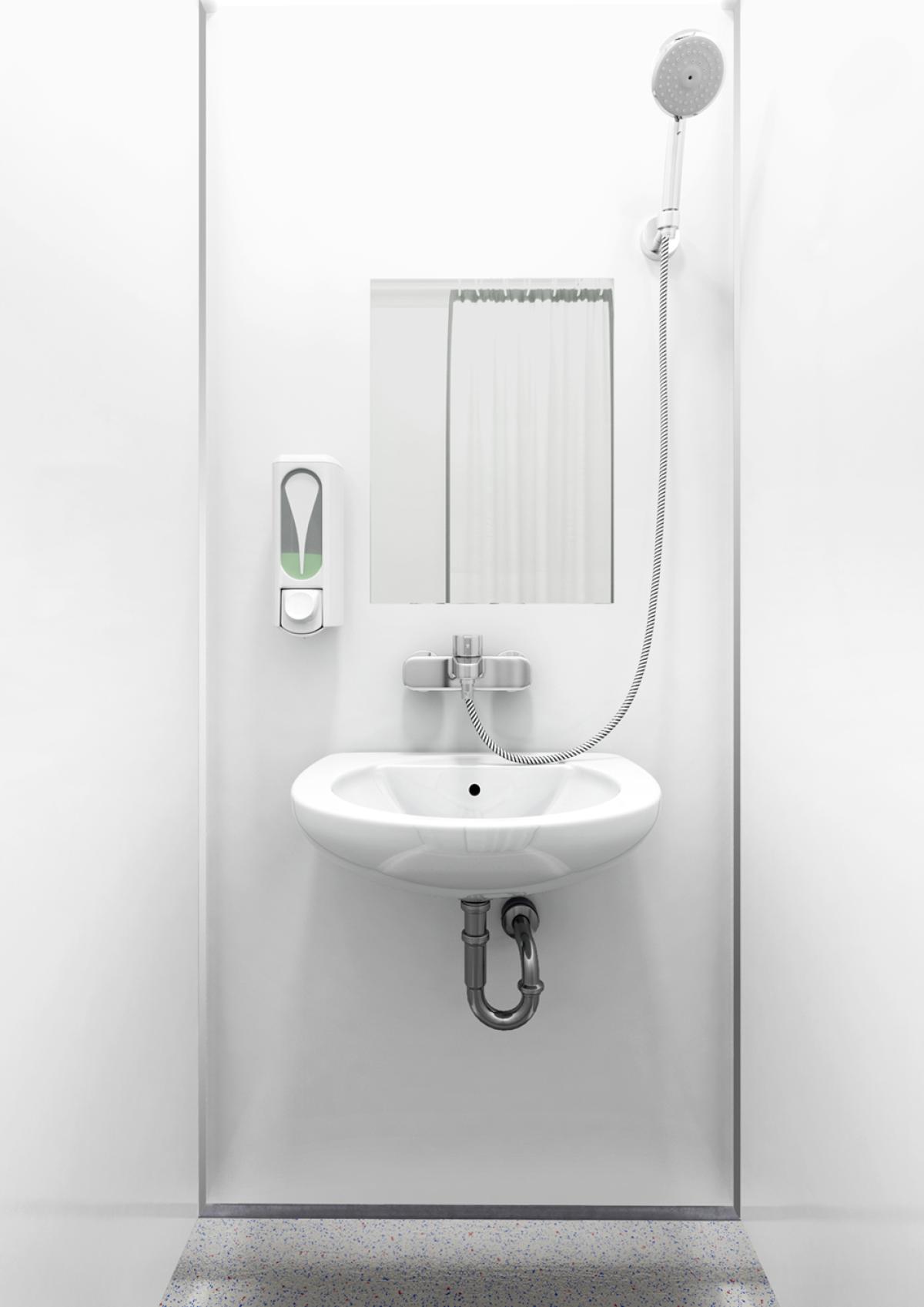 Dieser 20-Fuß-Container hat es in sich: Jeweils sieben separat nutzbare Duschen befinden sich auf den beiden Längsseiten des Construction Line Moduls. Jede der Kabinen ist neben den Duschvorrichtungen und einem zusätzlichen Vorhang mit einem integrierten Waschbecken ausgestattet; so wird der vorhandene Platz überaus effizient genutzt.
