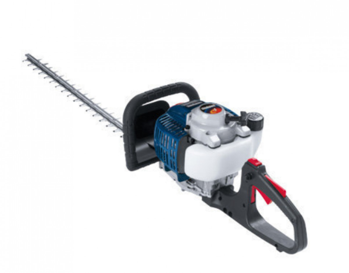 Die leistungsstarke Heckenschere ist mit einem 0,9 kW starken 4-Takt-Motor, 60 cm Schneidmessern und Drehgriff ausgestattet.