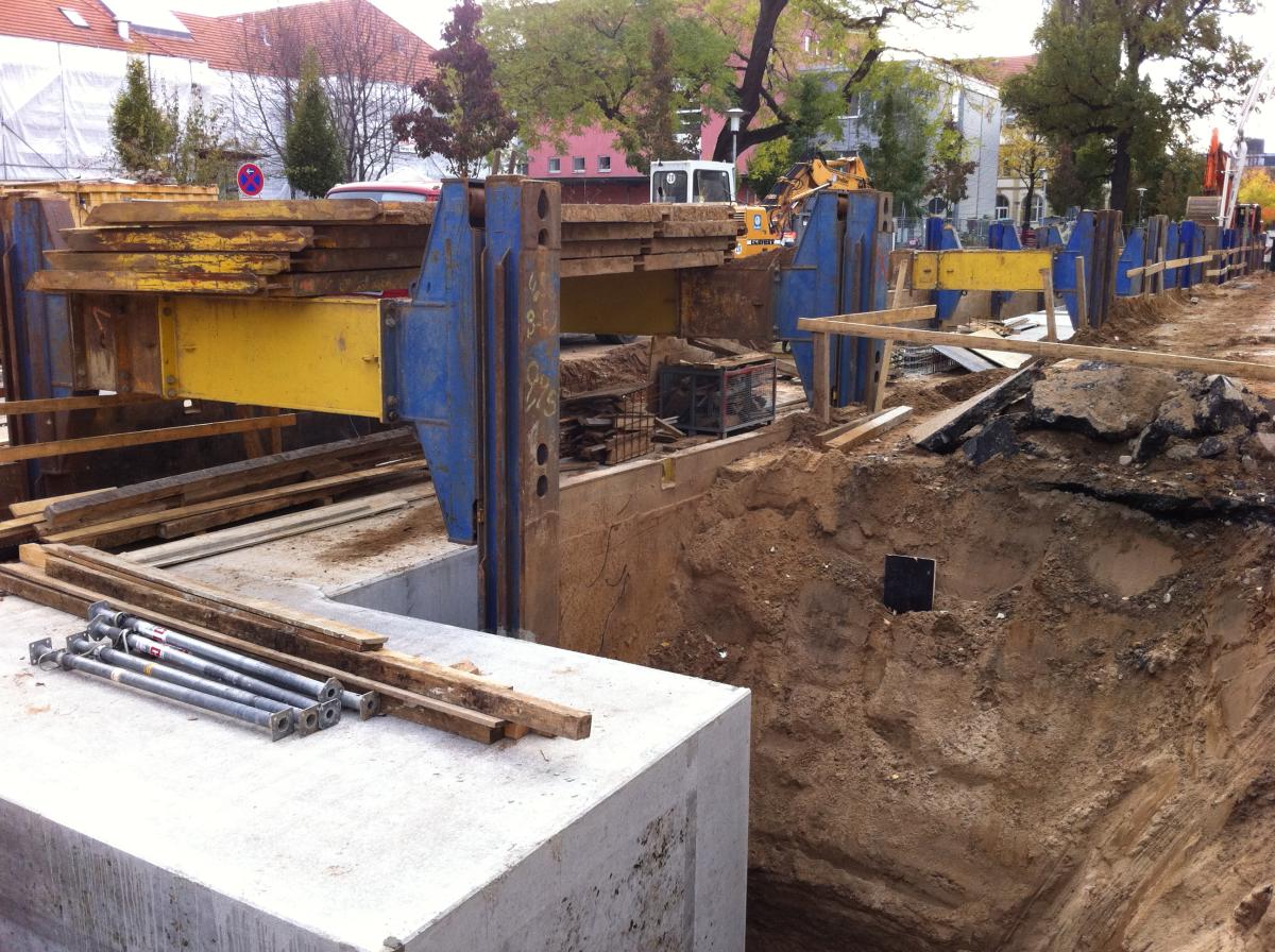 SBH Duble Stalowe szyny ślizgowe nadają się do średnich i dużych projektów budowy kanalizacji, które wymagają dużej wysokości prześwitu rur lub muszą być realizowane w obszarach narażonych na osiadanie gruntu. Wprowadzenie oparcia podłoża umożliwia większe prześwity rur, a dla wykopów budowlanych przy użyciu urządzenia napinającego Stabau możliwe są nawet wykopy bez przeciążeń o długości ponad 20 m i szerokości do 12 m. Studzienki mogą być całkowicie zamknięte za pomocą narożnych wsporników i płyt obudowy.
