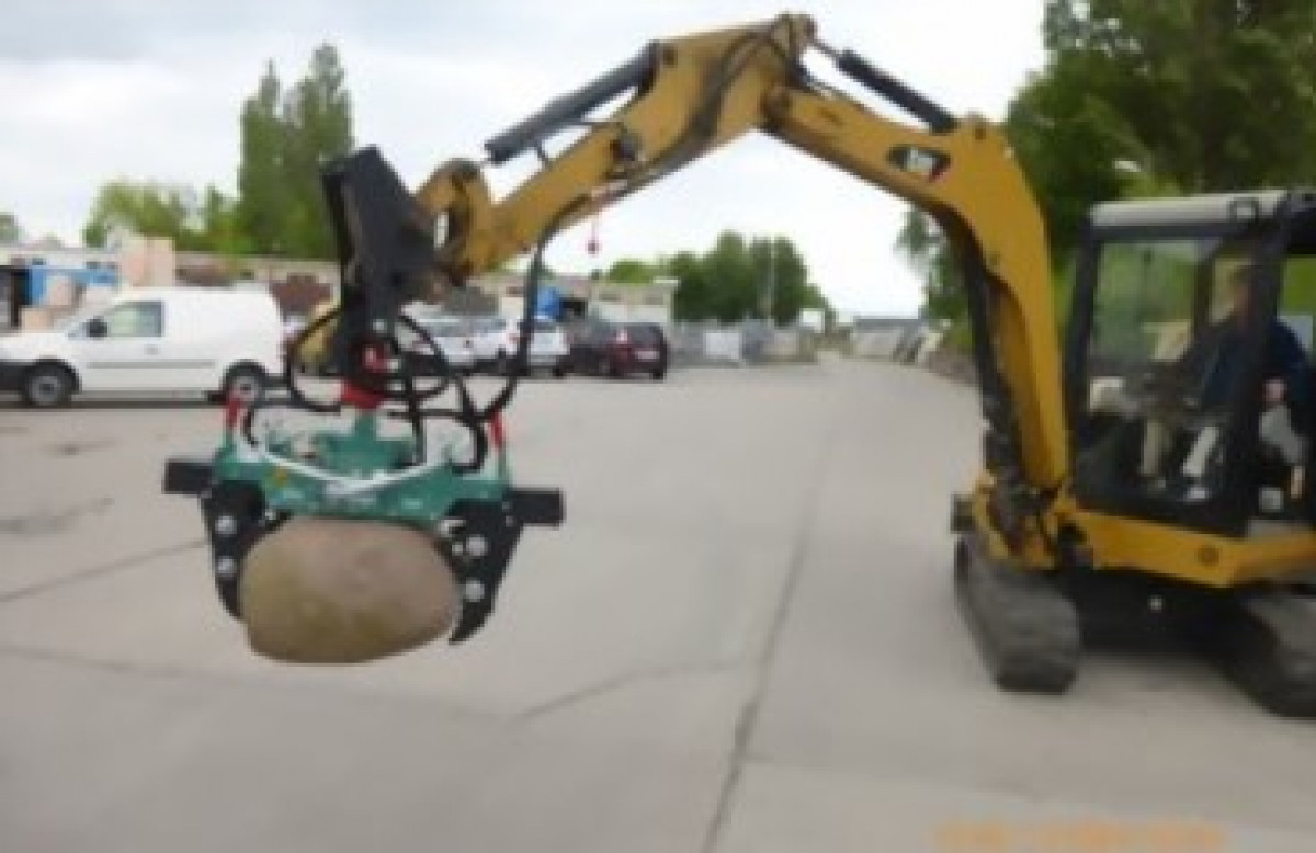 Steingreifzange Hunklinger Steingreifer für Findlinge bis zu 250 kg, ideal zum Setzen von schweren Teilen beim Bau von Gartenmauern, kostengünstig, sicher und schnell im Teichbau und Galabau.