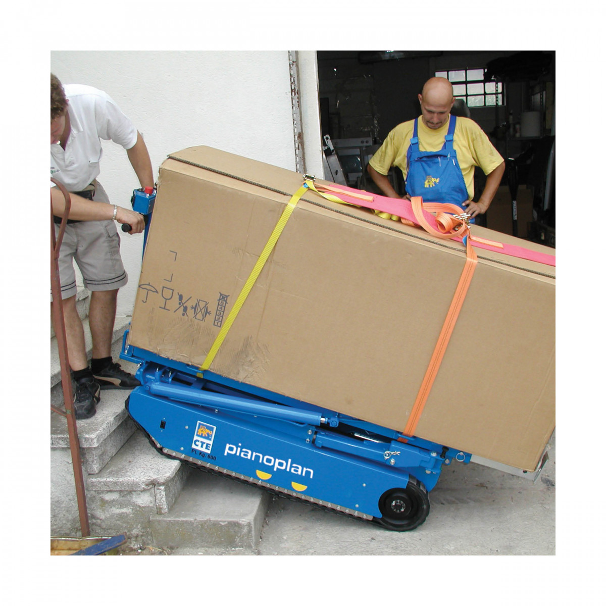 Der Pianoplan transportiert bis 600 kg auf der Treppe mühelos. Die Arbeit an sich erledigen somit 1 bis 2 Männer, wo vorher 4 bis 5 Mann notwendig waren. Die elektromagnetische Bremse gewährleistet beim Fahrbetriebsgang maximale Sicherheit. Es spielt für den Pianoplan keine Rolle, wie groß die Elemente sind, die es zu transportieren gilt.