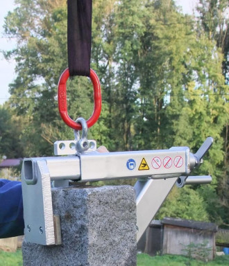 müheloses Abladen, Versetzen, Transportieren von Natursteinstelen; höchste Greifsicherheit; Tragfähigkeit 300 kg; Öffnungswinkel 80- 200mm; Gewicht 11 kg