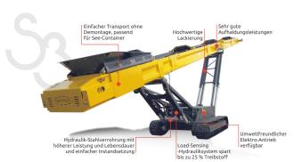 Das raupenmobile KEESTRACK Haldenband S5 mit 23 m Länge und 9,5 m Abwurfhöhe, mit einer Gurtbreite von 1.000 mm und einem Gewicht von 12,5 t kann bis zu 2.500 t Material aufgehalden, selbstverständlich mit „load-sensing“-Hydrauliksystem.