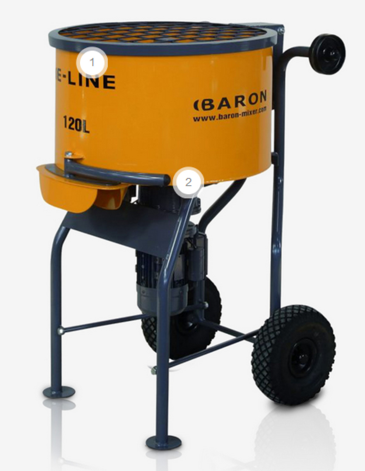 BARON E120 Zwangsmischer zum Trockenmörtel mischen, Leistung 2 kW, Netzspannung 230 V Drehzahl 32 U/min, Mischbehälter 117 l, Mischleistung 90 l, Auslaufhöhe 61 cm, Abmessungen (BxTxH) 62x85x108 cm, Gewicht 90 kg.