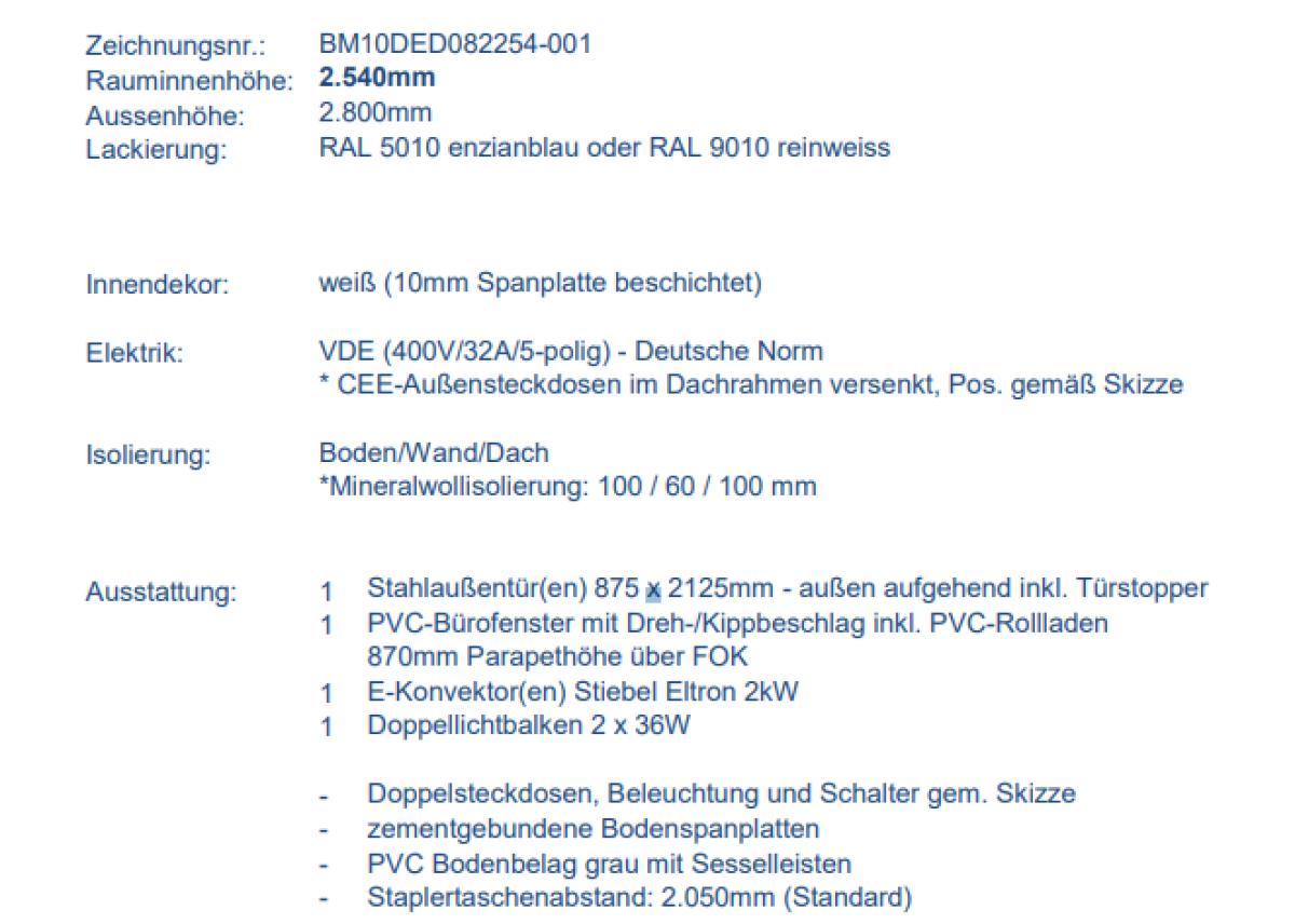 Rauminnenhöhe: 2.540mm, Aussenhöhe: 2.800mm, Länge: 2.991mm, Breite: 2.435mm