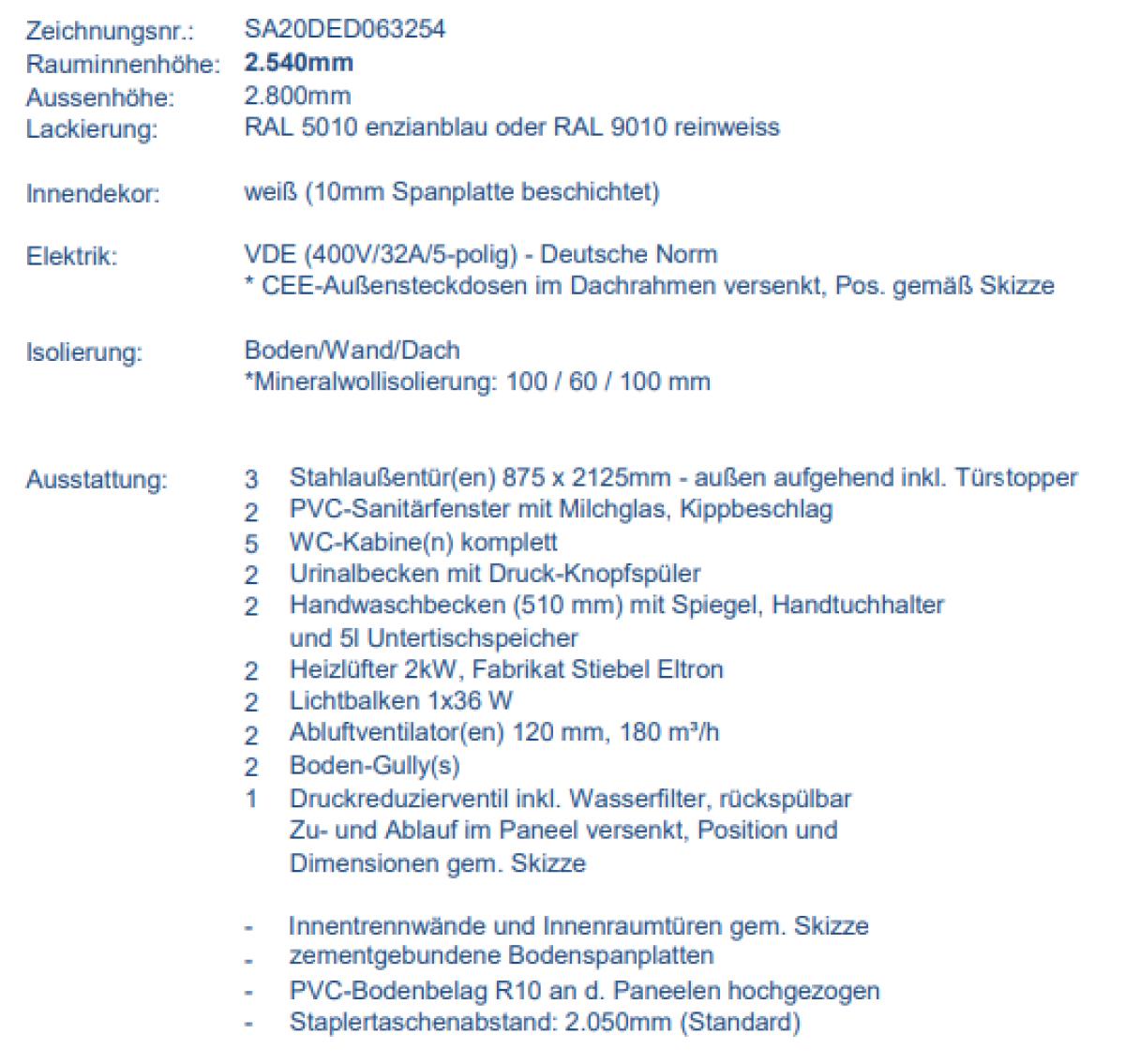 Rauminnenhöhe: 2.540mm, Aussenhöhe: 2.800mm, Länge: 6.055mm, Breite: 2.435mm