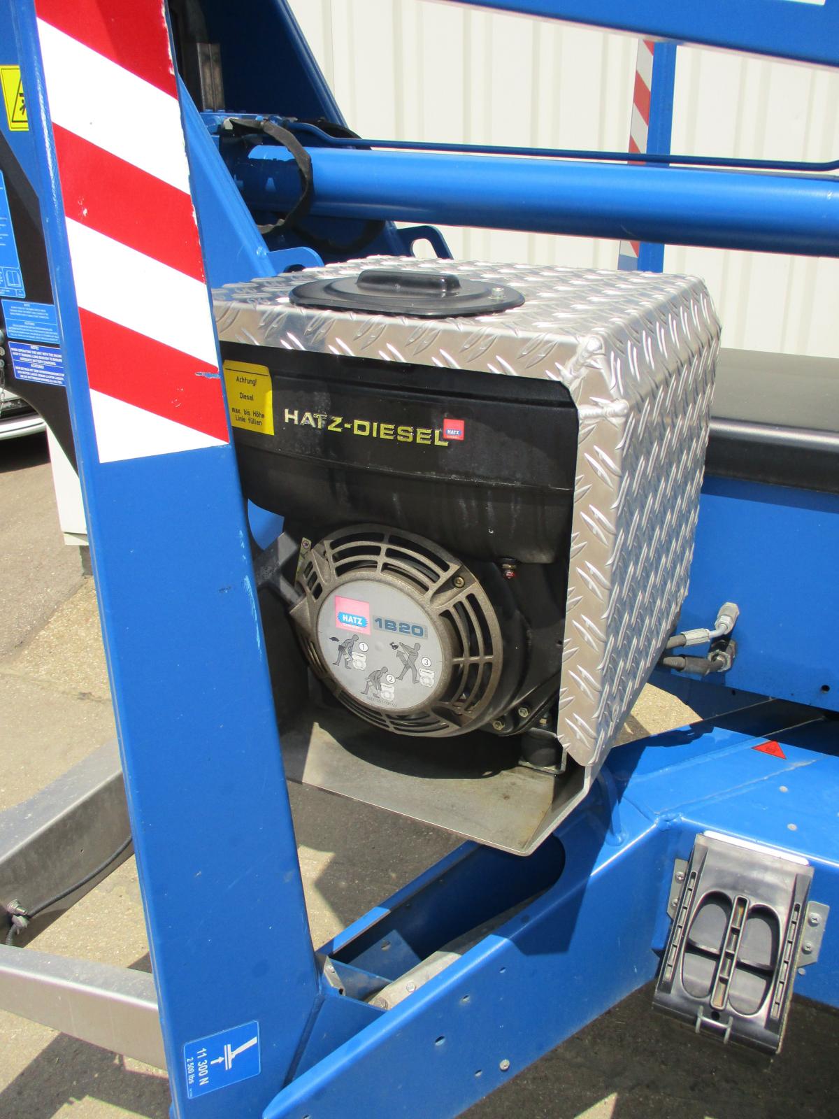 Sonderlackierung RAL 5010, Antrieb: elektrisch 230 V, Korb 90° drehbar, hydr. Fahrantrieb, hydr. Klappstützen.