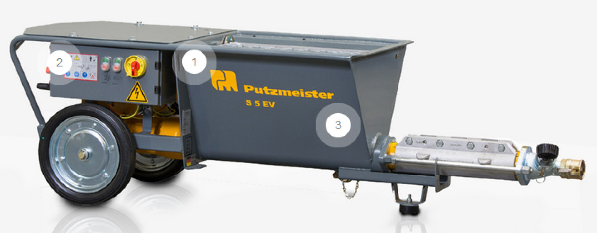 PUTZMEISTER S5 Schneckenpumpe, für Nassmörtel und Fertigputz fördern sowie auftragen. Die Basisversion eignet sich vor allem für Anwender, die pumpfähigen Nassmörtel bis 6 mm Körnung pumpen und spritzen.