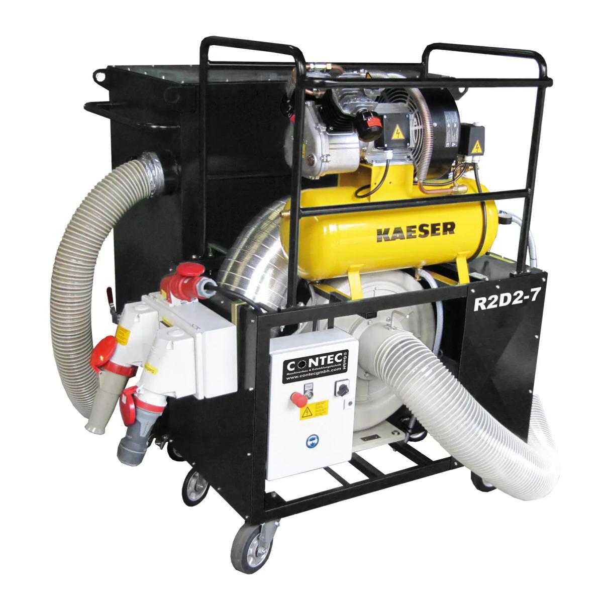 Der Aufbau und die Funktionalität der Absauganlage R2D2-7 ist entsprechend der Absauganlage R2D2. Es kommt allerdings ein stärkerer Hochdruckventilator und Kompressor zum Einsatz. Außerdem wird die Filterfläche um 2 Patronen von 10 auf 14 m2 erhöht. Die enorme Leistung der Absauganlage prädestiniert den R2D2-7 zum Entstauben der CONTEC© Kugelstrahlmaschinen ELGATOR und MODUL 350/2. Anwendung finden die CONTEC© Absauganlagen unter anderem in: